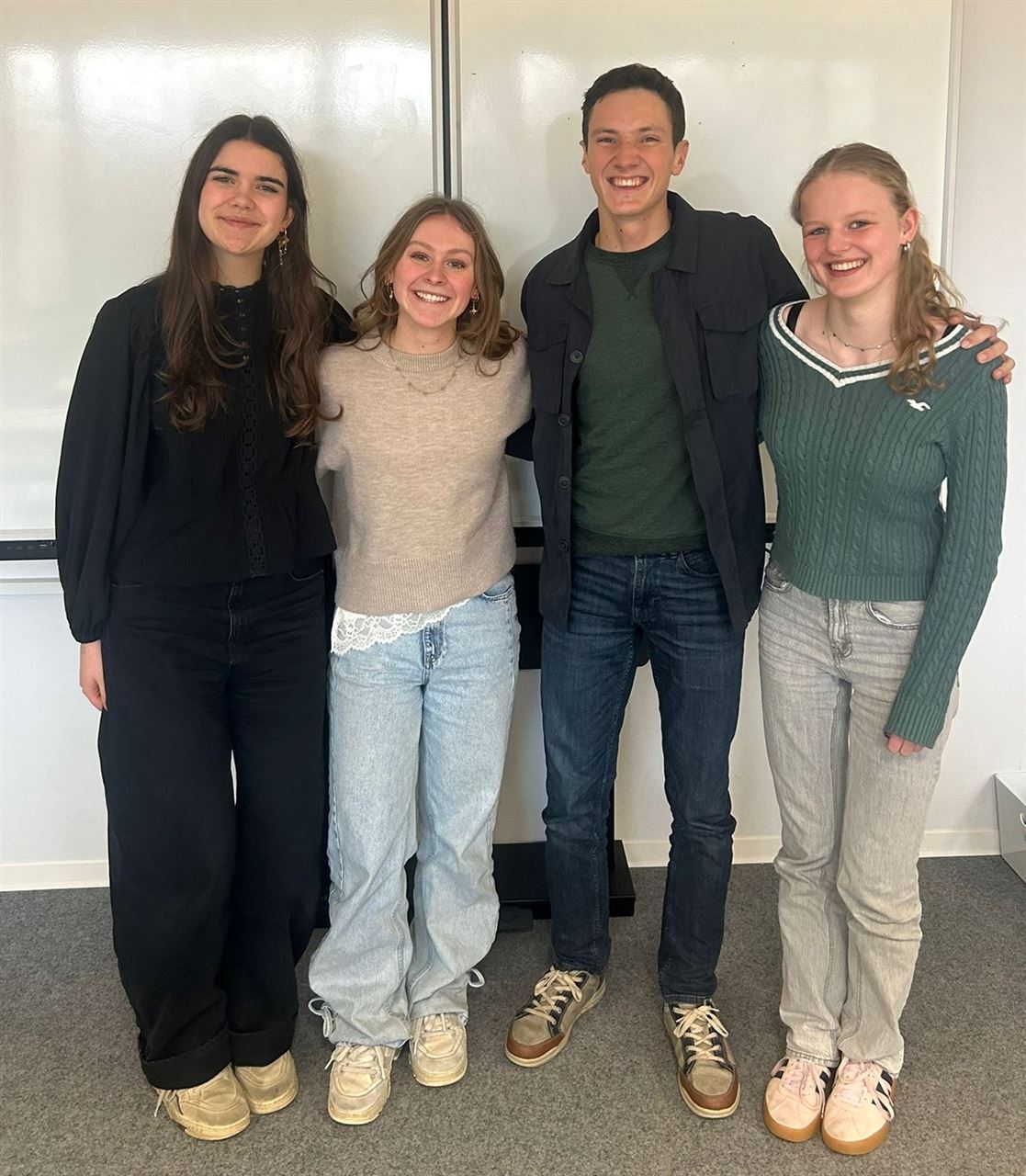 Bestuur leerlingenraad 2025-2026: Elske (secretaris), Tom (voorzitter), Juul (social media) en Evelien (penningmeester).