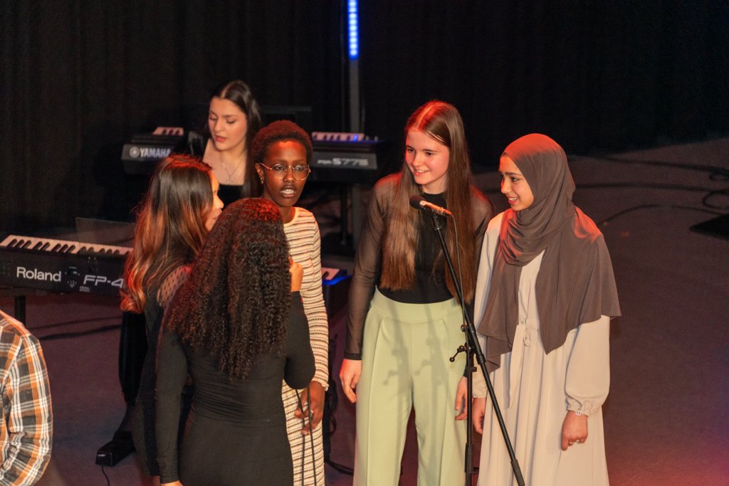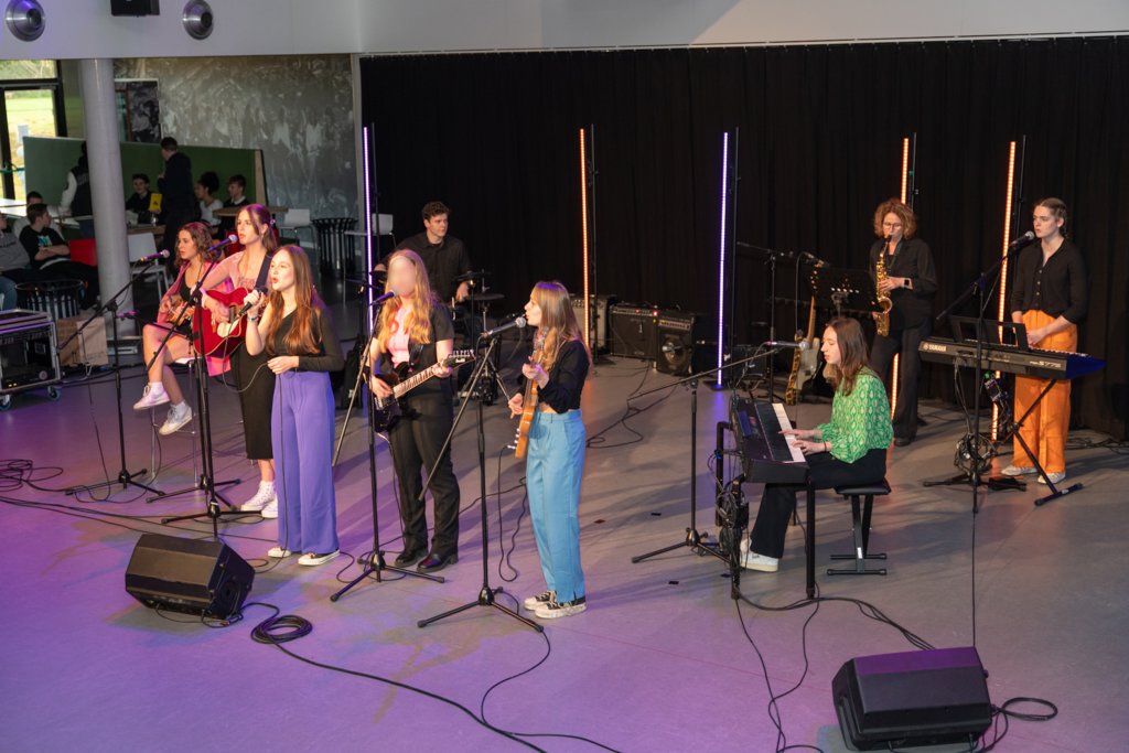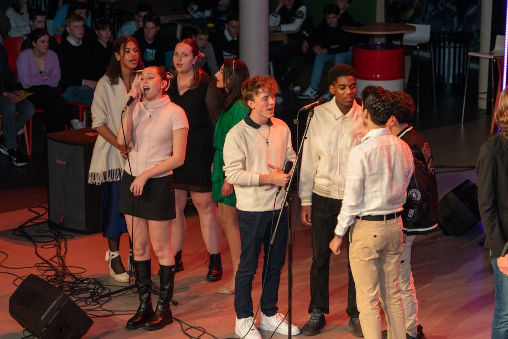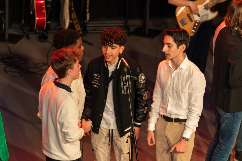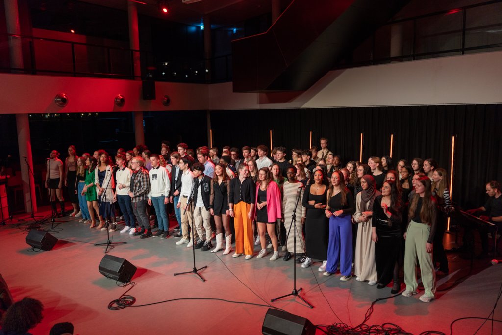 De avond werd afgesloten met het grote koor, waar ook de muziekleerlingen van 4 havo, 4 en 5 vwo meezongen. Gezamenlijk brachten deze 88 leerlingen een medley van Motown-nummers onder begeleiding van ‘Stijn en de Gummiberen’.